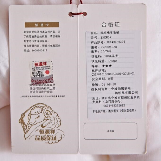 • 商品名称:恒源祥三星级可机洗羊毛被加厚保暖秋冬被纯羊毛全棉被芯单双人被 三星级可机洗羊毛被 220*240cm总重8斤填充5.4斤
