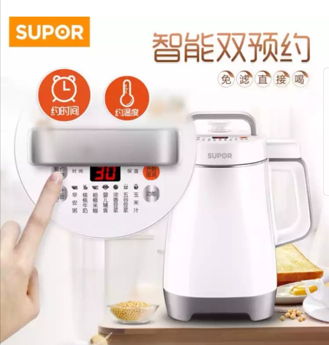 • 商品名称:苏泊尔(SUPOR) 豆浆机家用全自动破壁免过滤多功能米糊1.2L大容量 预约-白色升级版