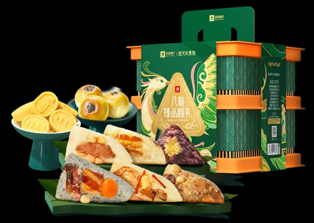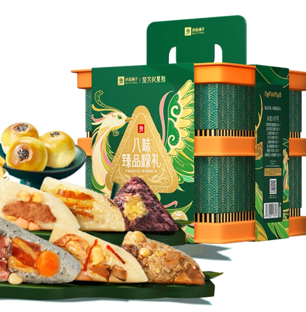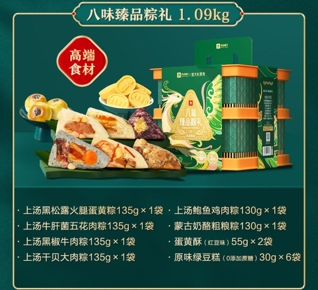 上汤黑松露火腿蛋黄粽135克*1/袋 上汤牛肝菌五花肉粽135克*1/袋 上汤黑椒牛肉粽135克*1/袋 上汤千贝大肉粽135克*1/袋 上汤鲍鱼鸡肉粽130克*1/袋 蒙古奶酪粗粮粽130克*1/袋 蛋黄酥(红豆味)55克*1/袋*2 原味绿豆糕(O添加蔗糖)30克*1/袋*6