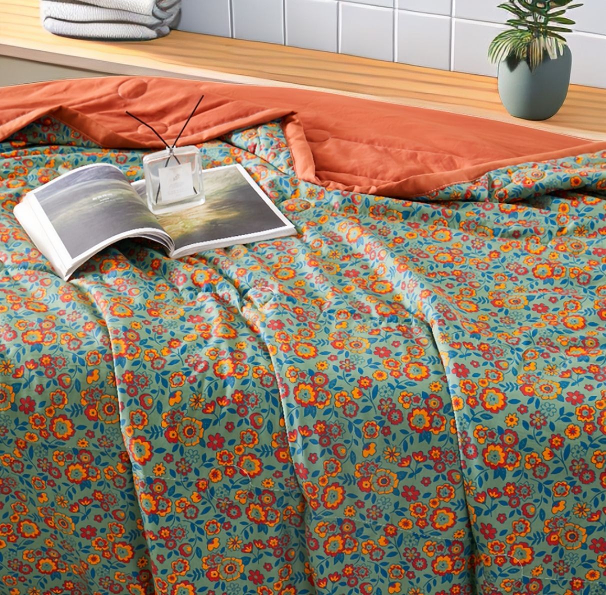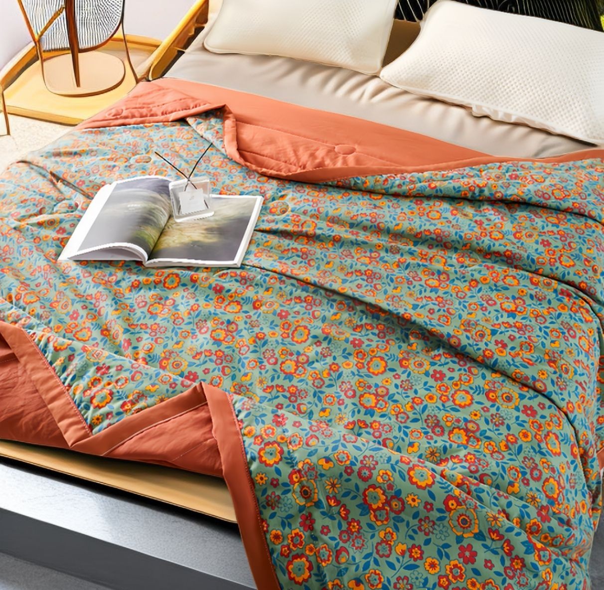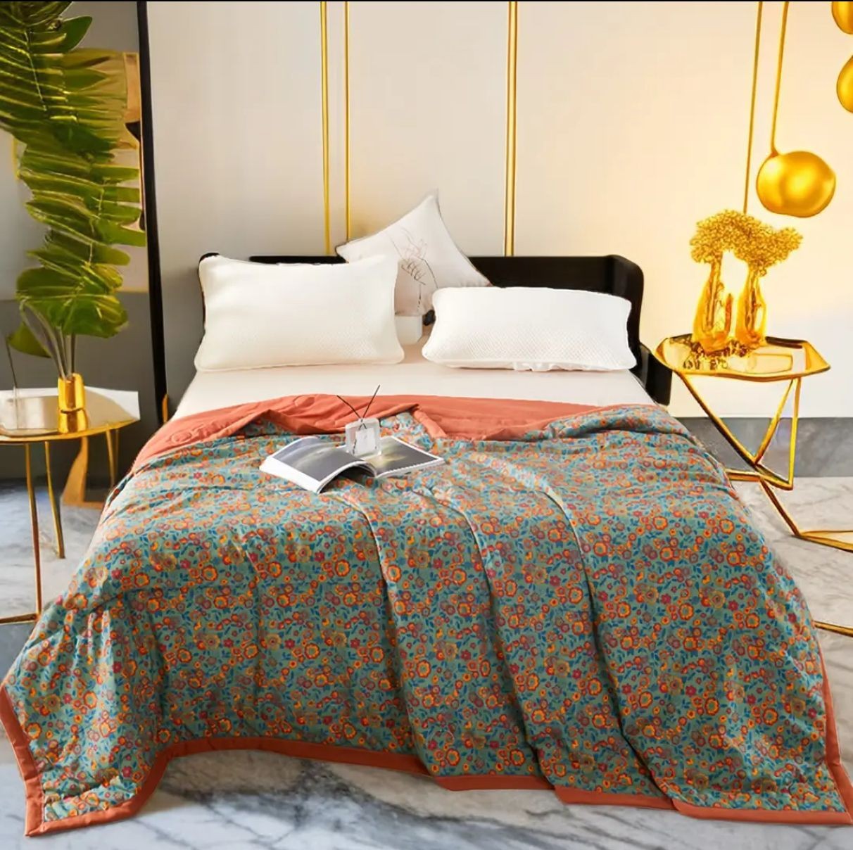 水帛冰氧棉繁花夏凉被单人双人时尚印花夏凉被春夏必备亲肤柔软 橘青色 150x200cm