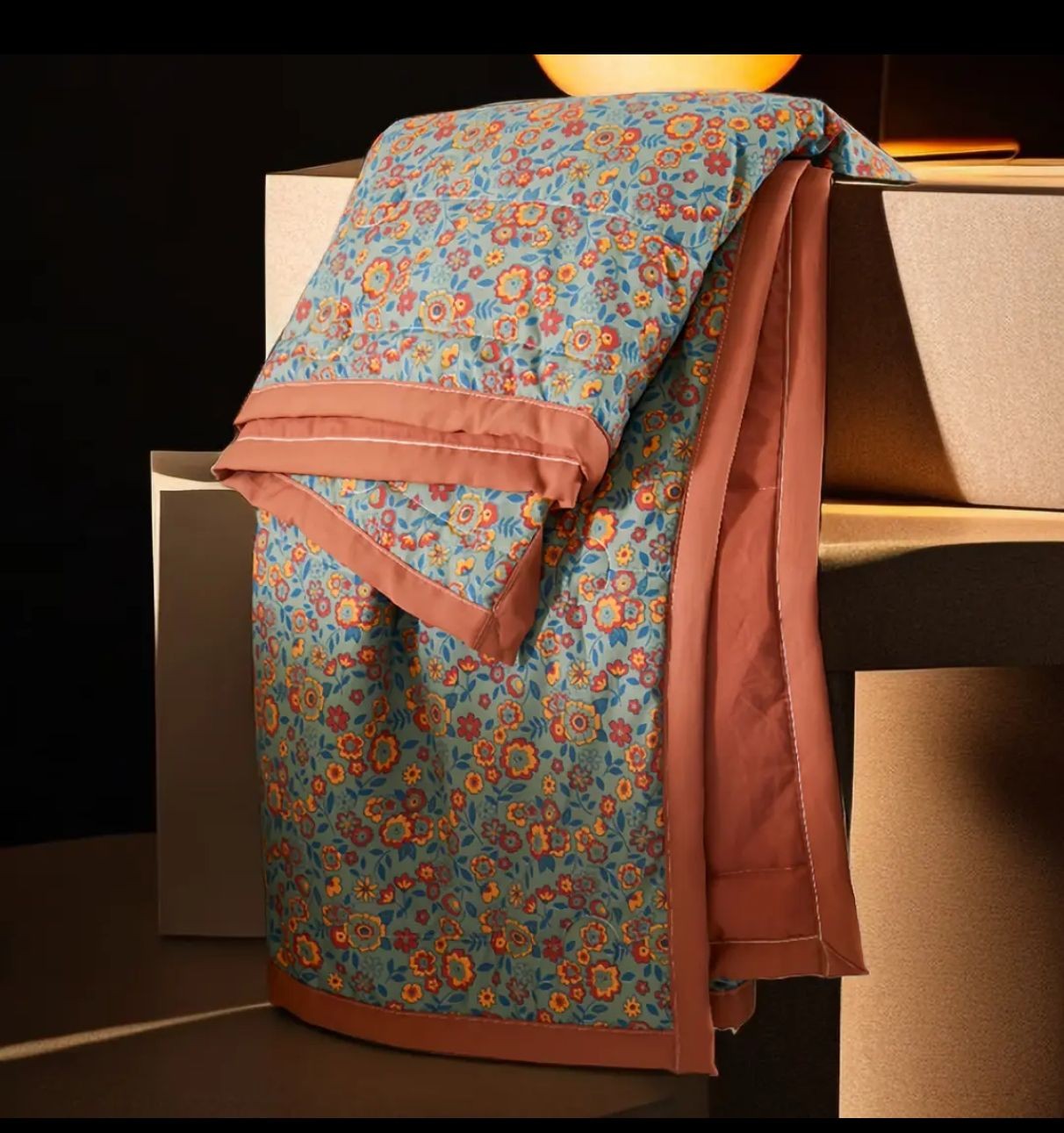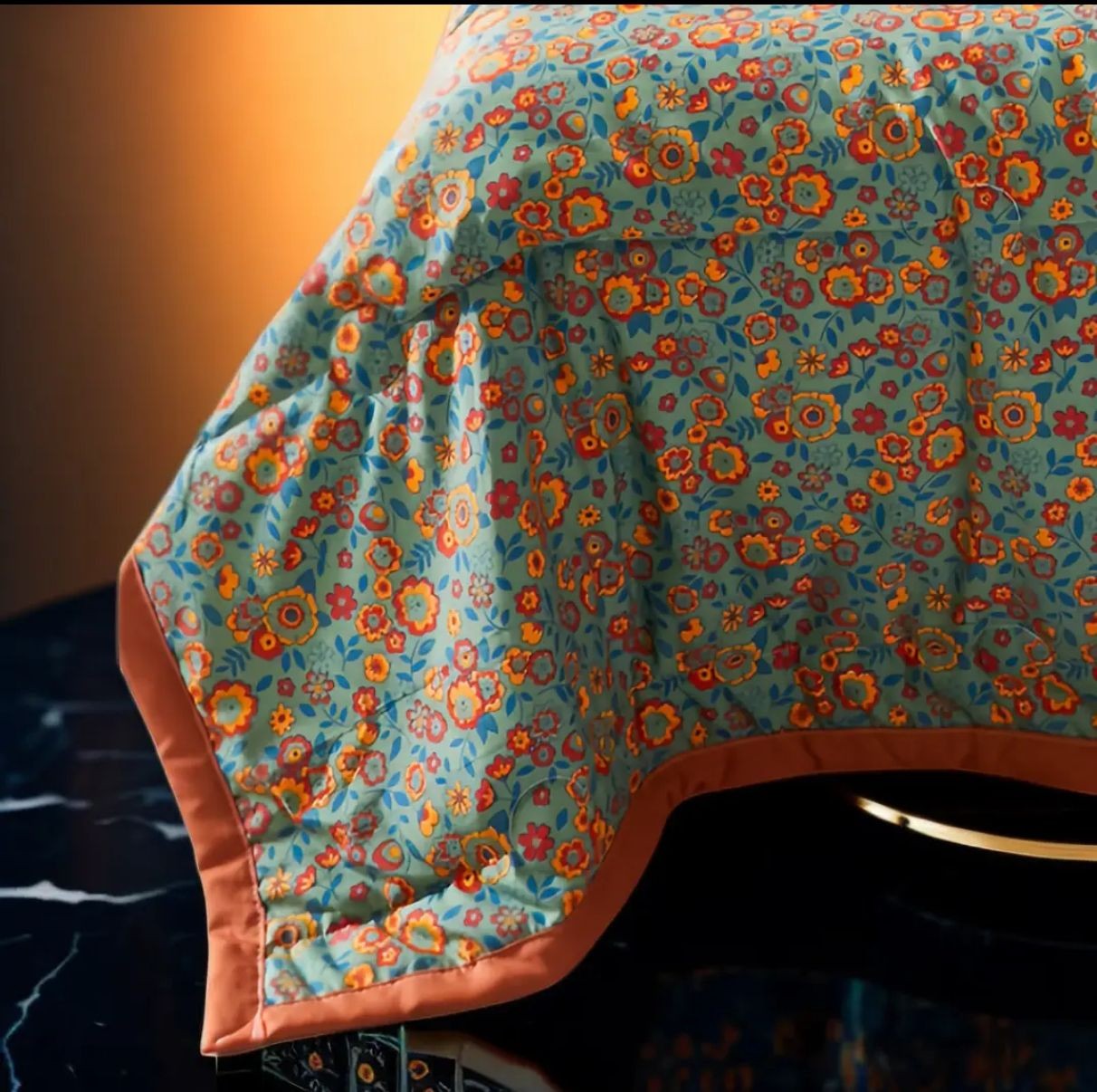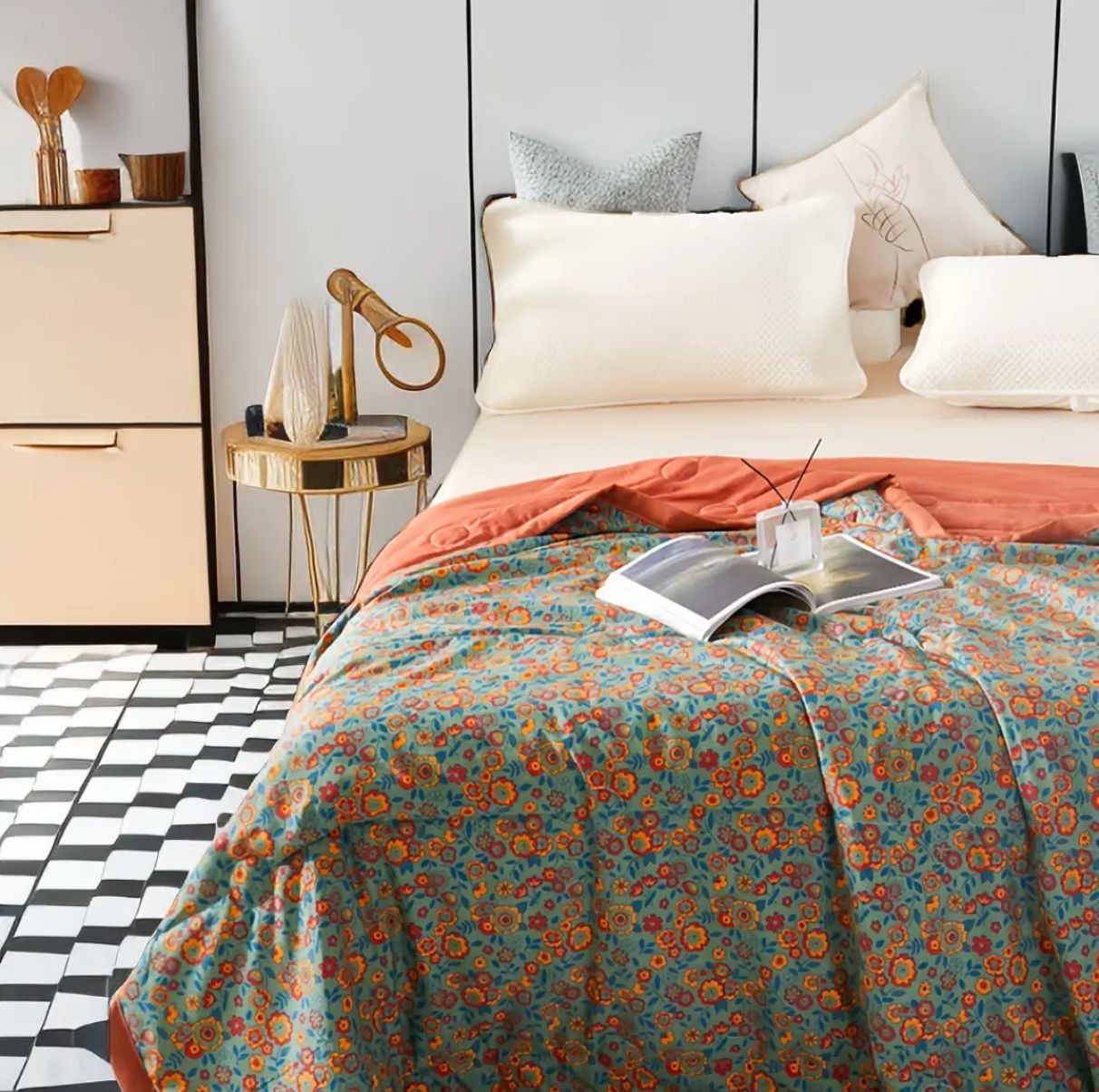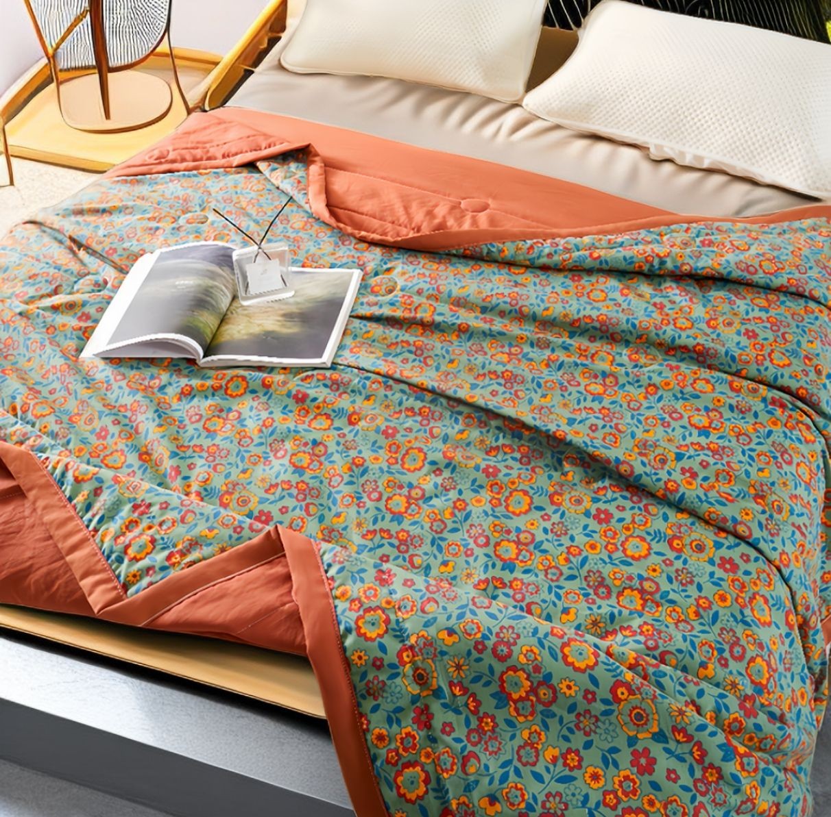 水帛冰氧棉繁花夏凉被单人双人时尚印花夏凉被春夏必备亲肤柔软 橘青色 150x200cm